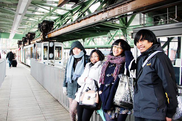 This day was freezing cold! Firu, Saku-chan and I took off from Mülheim just in time for lunch. We went to lunch and to the flea market. It started to snow but the flea market was still going on. On Easter too! We all snatched up something for ourselves. I got myself a pretty long pleated green skirt, Saku-chan got herself a small retro ’70s jar/chilli container while Firu gladly purchased a brand new water heater. Afterwards we headed to the main train station to meet up with Iva and her friends. We went there by the monorail. The kick is, the track runs over the train instead of under it, leaving the train hanging whenever it comes to a stop, thus the name – “schweben” means hang. It got me a little dizzy.
