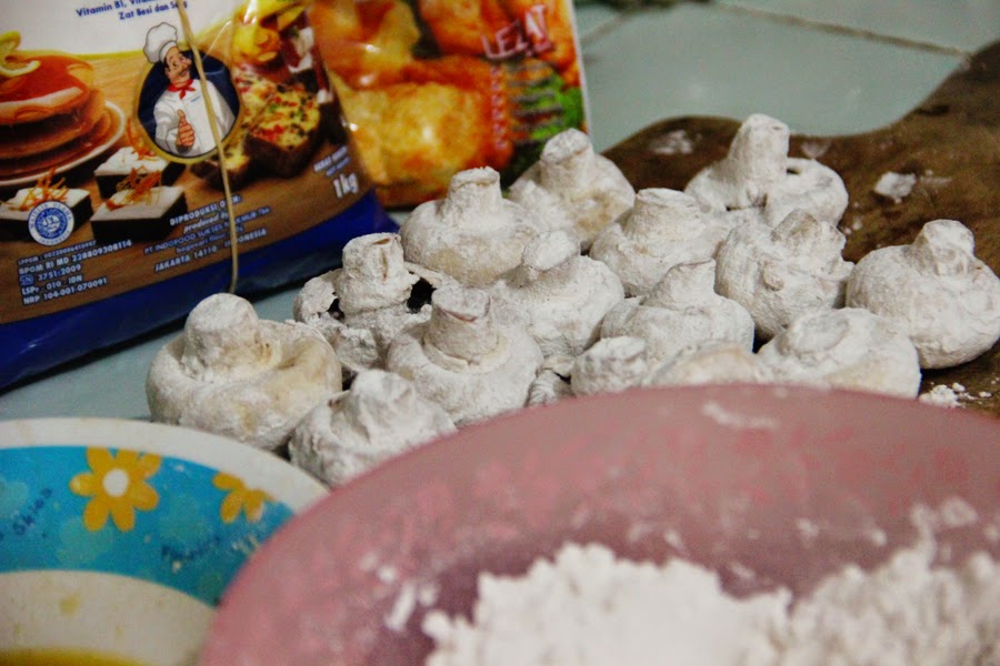 - Cover the mushrooms with the flour mixture then dip them into the beaten egg