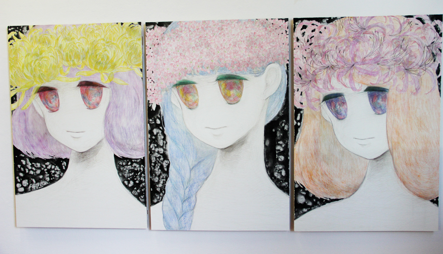 And, finally, Saku-chan‘s works. These three huge canvases are my favourite. I was instantly blown away as I spotted them. I love the feminine hue of the ladies and the natural beauty she put into them. Fact: not only did she paint the whole thing herself, she also made the canvases herself. These pictures don’t do them justice, ‘course. The canvases are actually pretty huge, like 100x200cm, give or take. Though her works seem so simple – compared to other artworks I do not understand – , it contains all these emotions and energy and splashes of colours that I adore. Aside from that, she also put up a lot of drawings as a study of Hanagasumi. Marvelous!