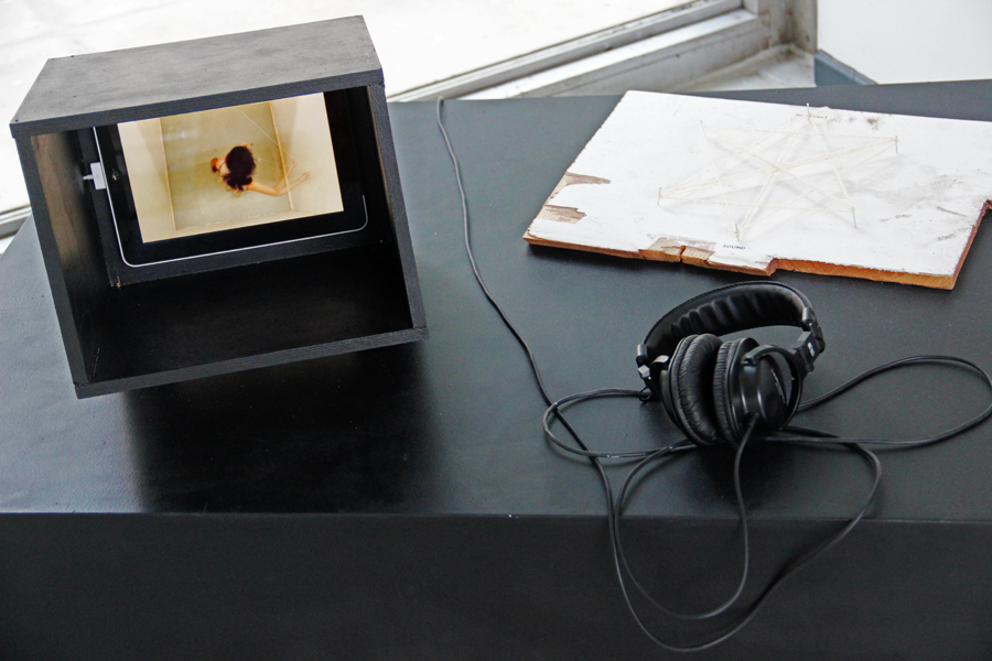 Here are some of Shasti‘s artworks, there was also an incredible painting alongside it, which you can see here. I love how she arranges the items of her creation and the words that she used to portray her works. Also, there’s a video playing in a loop on an iPad next to the David star made out of a string. You can also listen to the video as it has this music, which has such an effect to the movements. Unfortunately, I was unable to portray everything beautifully. And, yes, by the way, that black string wound around a spinning needle is actual human hair…hers, if anything else. She basically spun it herself. You can check out the video here, the spun hair process here and more on the jar of collected goods from nature here.