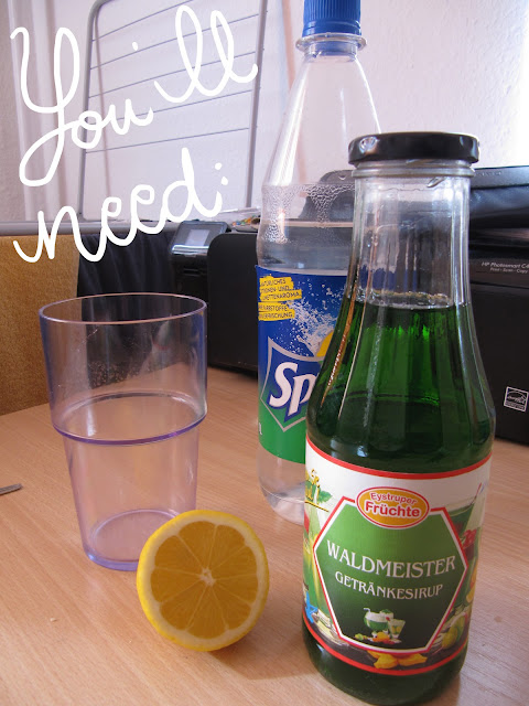 Woodruff syrup, soda water (I used sprite because its soda is richer), and lemon