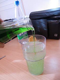 First pour as much soda water — or any other soda drink you use — as you’d like into a glass. Pour the syrup into the soda — and watch the colour change exquisitely. You can pour the syrup first then the soda, I don’t think it makes a difference. Squeeze the lemon as hard as you want — depends on how much juice out of it you want. And voilá! You may now enjoy your Woodruff Soda. It’s best served chilled and with a cake/pudding as a side dish.