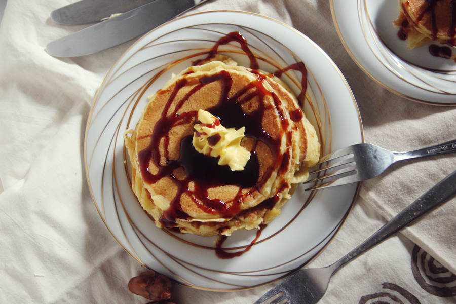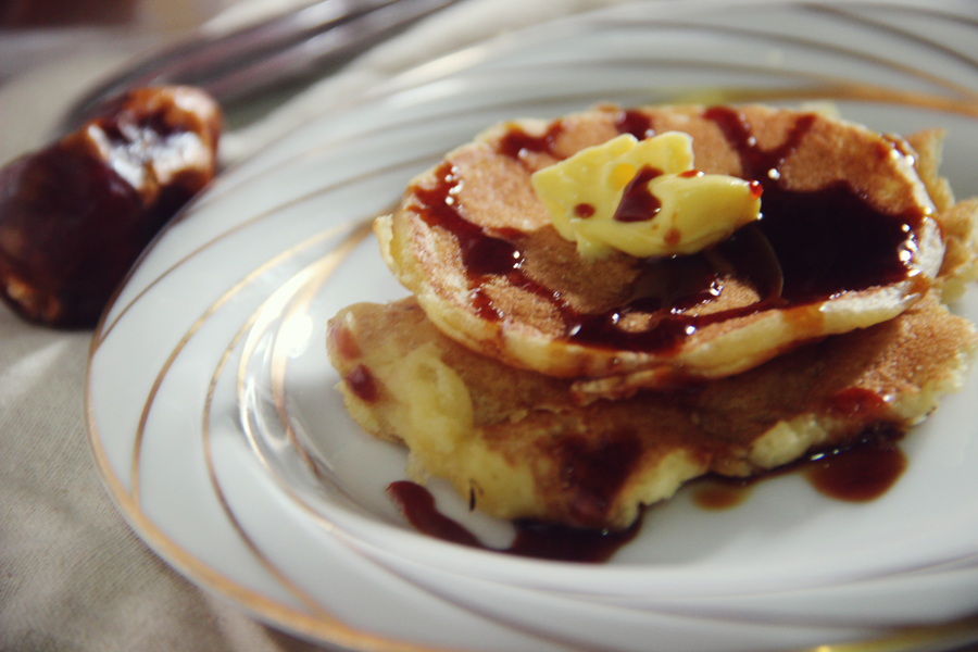 A couple weeks ago, my parents came back from grocery shopping with this strange liquid in a jar. When I looked at the label, it turns out to be date syrup, which I’d never known existed before. As it looks similar to maple syrup, I thought I’d use it for pancakes, so here it is. The recipe will only be a quick recipe of a regular pancake—cooked american-style—that you can practically find anywhere, really. Nevertheless, I hope you at least enjoy the idea and will try it out at home yourself.
