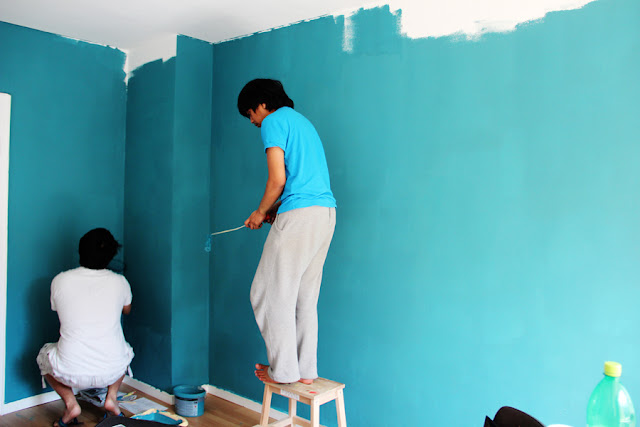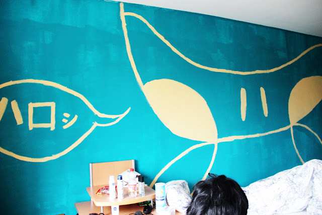 Here it is! The post everyone has been waiting for…probably. In my last post, I mentioned how I was going to revamp Firu’s room. Well, here’s the story. On April 1st we started with the whole process. Before they were painted, the walls to Firu’s room were white. Though I think it was very nice and made the room look bigger than it probably is, I am very happy by how they look now. Firu, Sakurako and I scratched some ideas on paper. We came up with several varying designs. Ultimately, Saku-chan’s designs were picked. We all – including one of Firu’s flatmates – started painting the background colour. It’s probably hard to tell from pictures but we used two different background colours for two halves of the room. Too bad, before we even started painting the designs, Saku-chan had to go home because her friend was coming the next day. Thank God we managed to finish the background colours in one day, though.