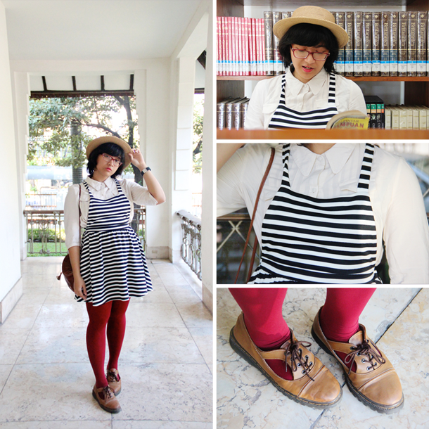Asos pinafore dress // hand-me-down shirt + tights // Urban Outfitters hat // Kmart purse (Sis’s) //