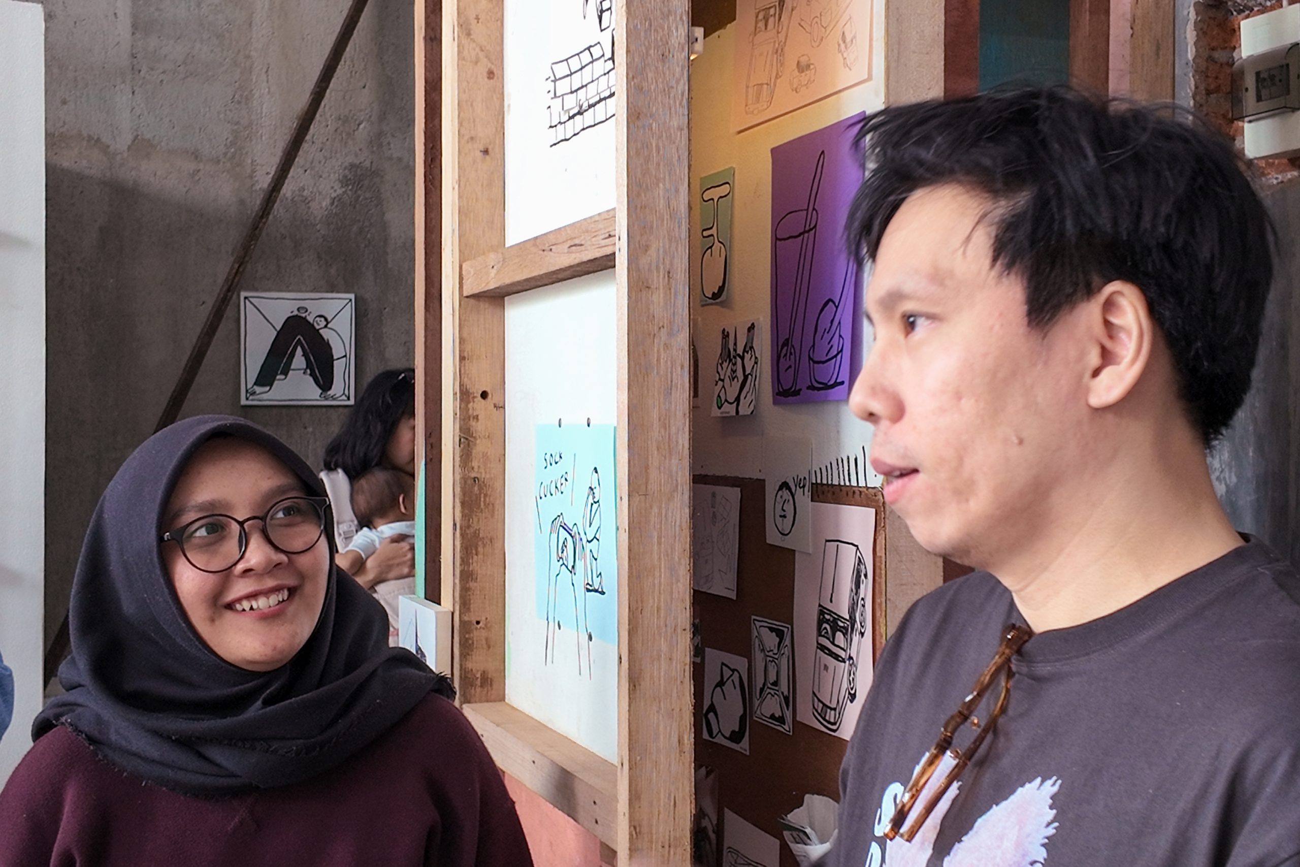 I also really love and enjoy these little nooks where you have to put your head all the way in to enjoy the artwork altogether. The nook contains little illustrations by Fandy, portraying the many different facets of his personality and experiences—with snippets of his current home as well, portraying the imperfections of his humble abode. Most of the works displayed at the exhibition are spread out across the space, so you’ve got to have a keen eye to capture each and every one of them. There are a lot of easter eggs being strewn about.