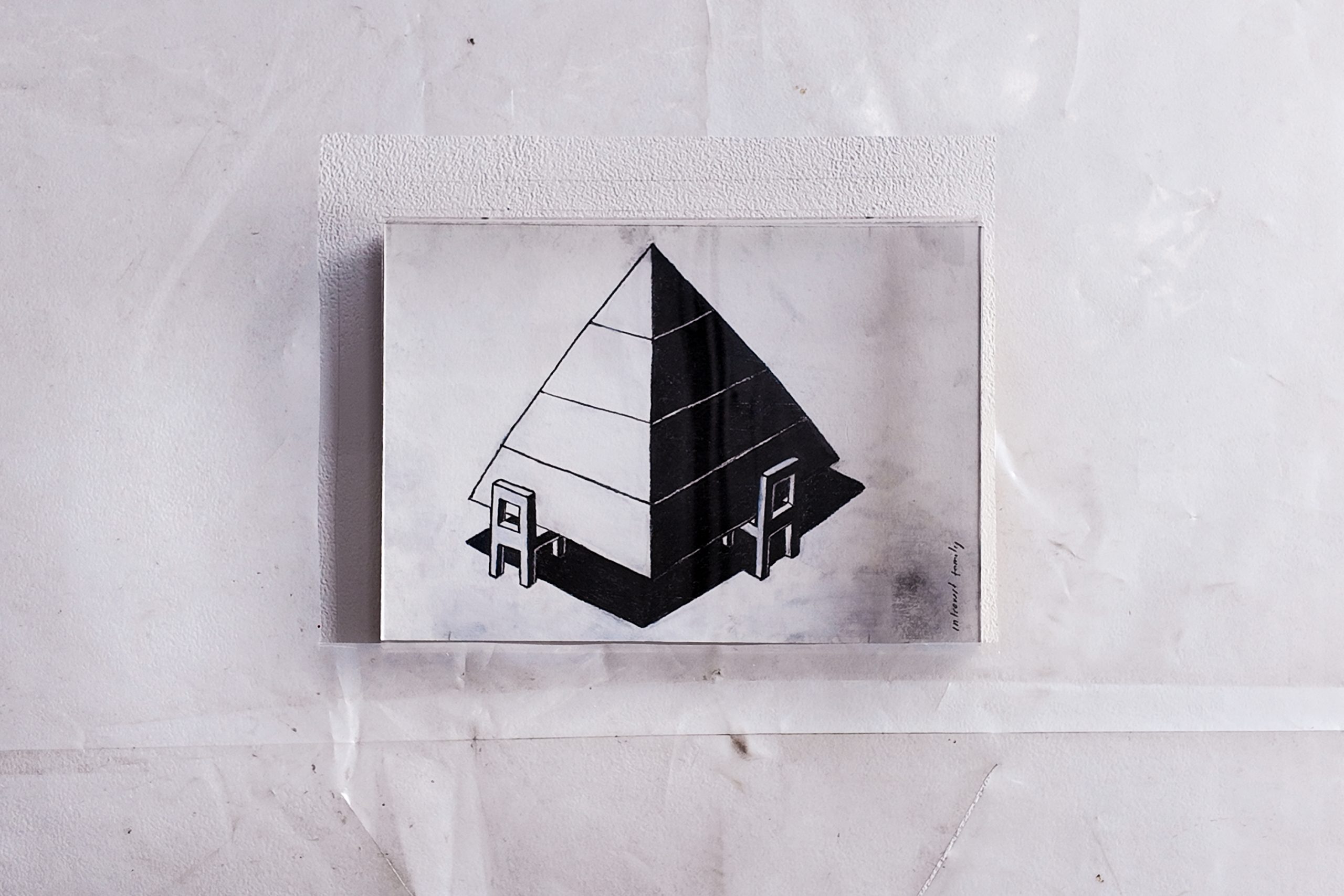 The exhibition is very conceptual, with the space being divided into two parts. The works consist of illustrations, furniture, and little sculptures—among other things. The space itself is designed to look like a home renovation or building in progress, using used, decaying wood, with plastic wrappings hanging over an industrial wall. It is meant to mirror the concept of the exhibition that basically explores the idea of an ideal home, emphasising that an ideal home is always a work in progress.