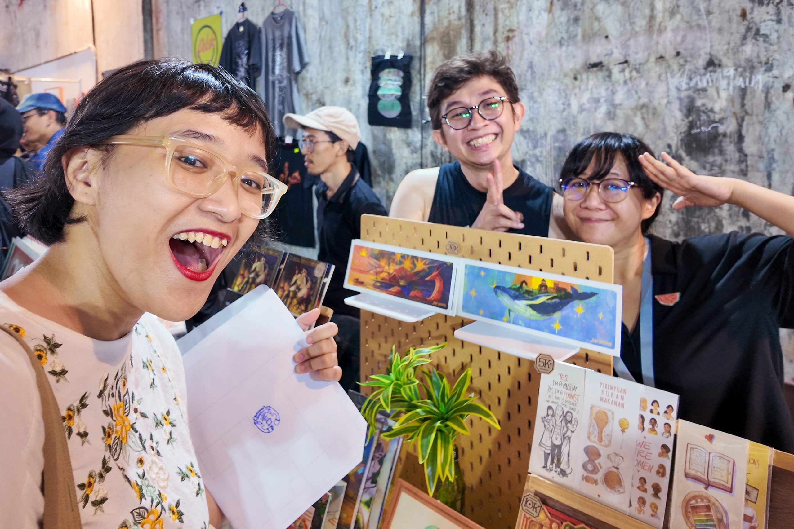 Once we got there, we all went our separate ways, flocking to wildly different types of tenants. While Guntur and Bulbul were mostly fascinated by the new, old technology that allows very specific types of products to be produced, Uta checked out a lot of the post-punk materials and all that leftist-minded publications. Meanwhile, I went from one illustrator to the next to find the cutest items to collect. Somehow, I got unexpectedly reunited with an all-time favourite illustratior, Azisa Noor (and her friend Zora). I bought two zines and pre-ordered one—all of them are illustrated and speak about food and beverages. Didn’t mean to target a specific kind of zines, but somehow that’s where I ended up.