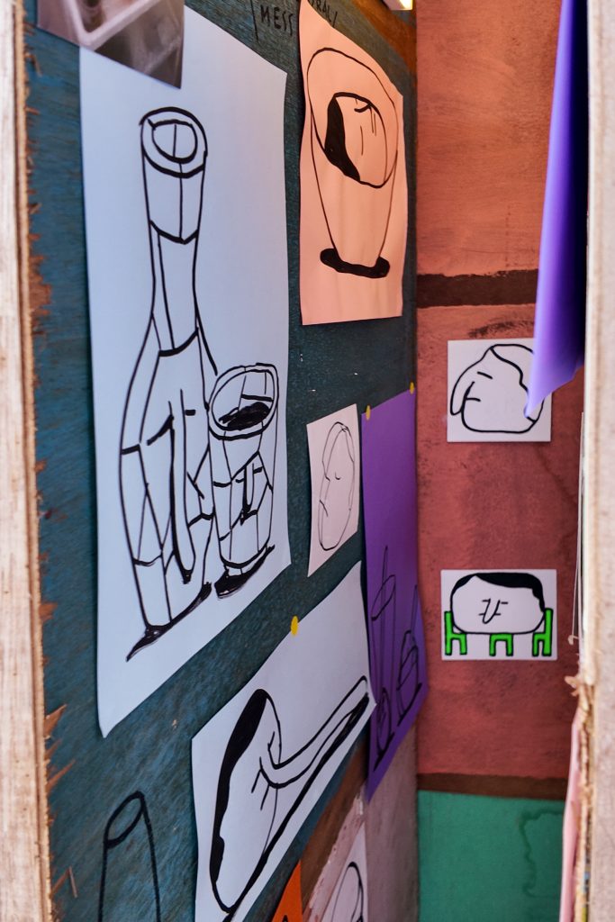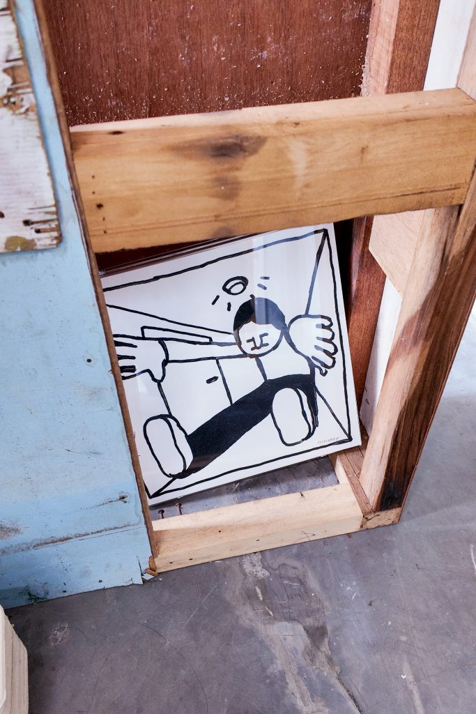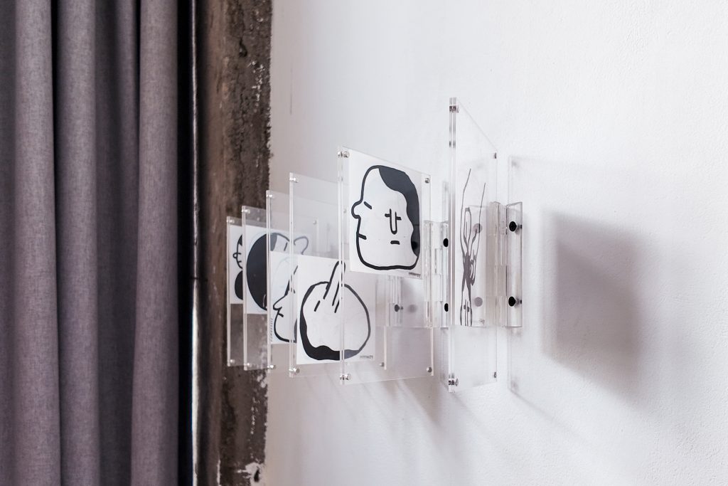 The exhibition is very conceptual, with the space being divided into two parts. The works consist of illustrations, furniture, and little sculptures—among other things. The space itself is designed to look like a home renovation or building in progress, using used, decaying wood, with plastic wrappings hanging over an industrial wall. It is meant to mirror the concept of the exhibition that basically explores the idea of an ideal home, emphasising that an ideal home is always a work in progress.