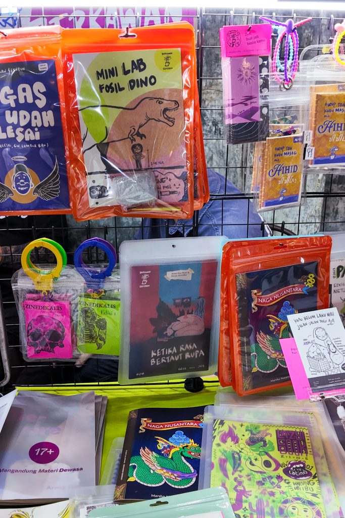 Once we got there, we all went our separate ways, flocking to wildly different types of tenants. While Guntur and Bulbul were mostly fascinated by the new, old technology that allows very specific types of products to be produced, Uta checked out a lot of the post-punk materials and all that leftist-minded publications. Meanwhile, I went from one illustrator to the next to find the cutest items to collect. Somehow, I got unexpectedly reunited with an all-time favourite illustratior, Azisa Noor (and her friend Zora). I bought two zines and pre-ordered one—all of them are illustrated and speak about food and beverages. Didn’t mean to target a specific kind of zines, but somehow that’s where I ended up.