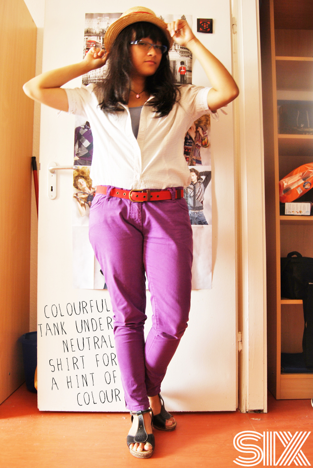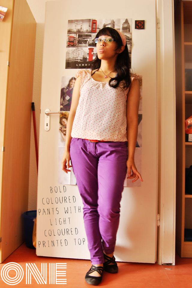 Bold coloured pants are my newest obsession yet. It gives an otherwise dull look a playful edge. But if it’s only colour on colour, things can look pretty boring pretty fast too. So pairing it up with a subtle printed top is a way to go. Of course, since the pants are already bold, it would be better to pair them with a neutral coloured top.