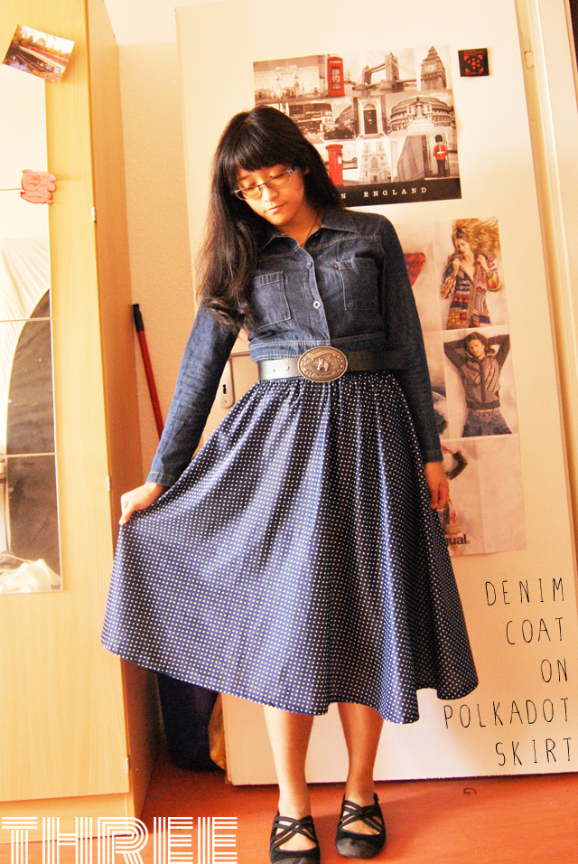One of the many great things about denim is that it has textures that make it unlike any other material — less plain — and yet it doesn’t have any patterns/prints on it — normally, anyway — which makes it highly versatile for any kind of clothing piece. I also love how denim can give a tomboyish edge to a feminine outfit. Try mixing denim with printed or patterned skirts that you have and see how they look together. My favourite blue polkadot skirt and this denim coat, at least, get along.