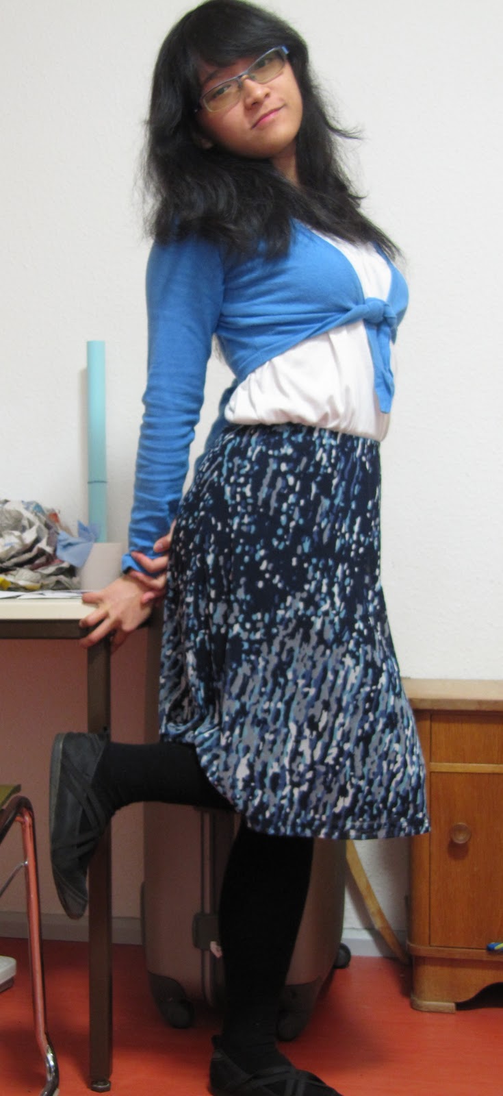 Now this is my outfit from yesterday. The white blouse is from Matahari Department Store back in Indonesia. The bolero I got from NKD for only a couple bucks. The skirt is an Esprit original on discount. The ballerina-like shoes are from Tracce.