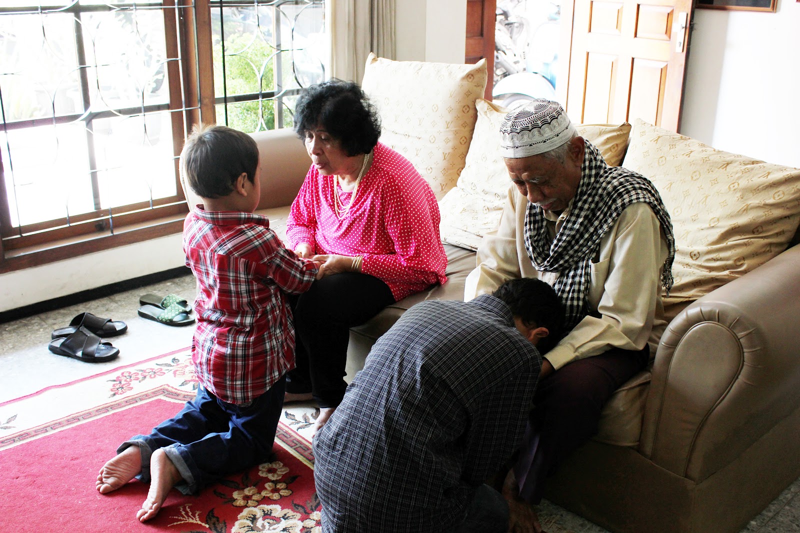 We started off by ever so beautifully decorating the dining table with food and seasonings as well as sauces. As the ladies did this, the men arranged the living room to make it wider. The next event is why. Our grandparents (Titi and Kakung) sat on the sofa, dressed in clean and neat clothes. They were ready for us, their children and grandchildren, to ask for forgiveness and vice versa. This usually goes on for around ½ to 1 hour and not without a few tears. Afterwards, Titi and Kakung would ask forgiveness from one another. Such a sweet sight! I love seeing my grandparents all lovey dovey and happy. Then we proceeded by Kakung giving out Eid bonuses to his grandchildren – this time, minus my oldest cousin, who’s had an income of her own. We then formed a circle around the fortunately circular dining table, except for my youngest cousins, and followed Kakung’s lead in praying before we dug in.