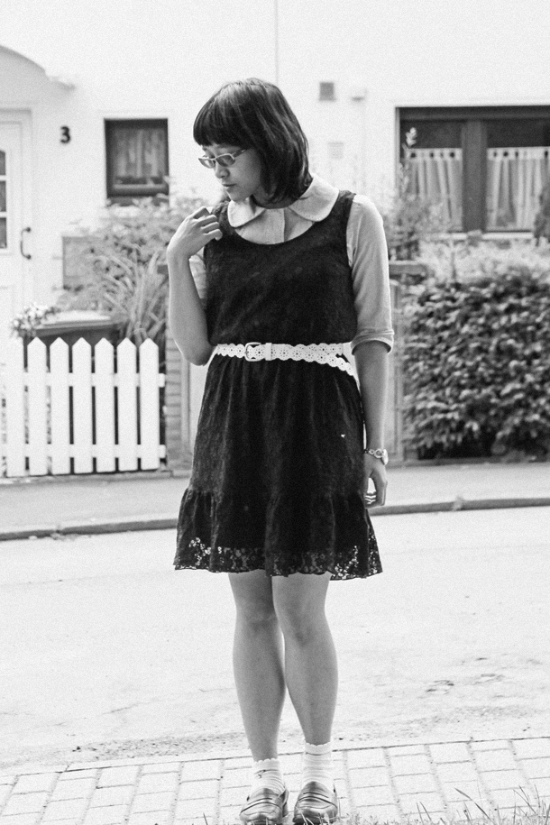 Atmosphere blazer (as top) // Esprit lacey black dress // Tally Weijl belt // Mom’s backpack // Primark socks (gifted) // Vintage penny loafers