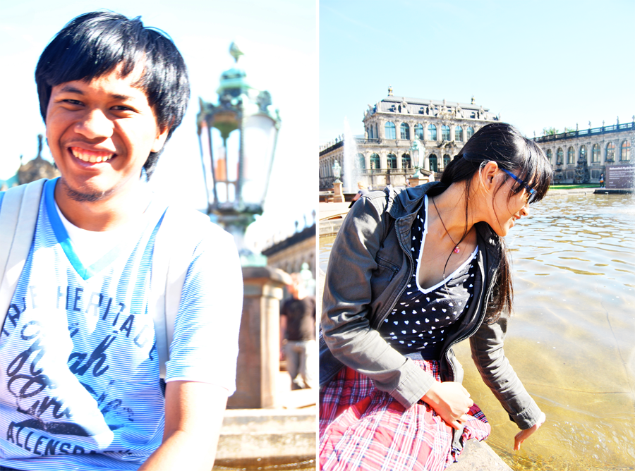 We were just hanging around on of the fountains at Zwinger, playing with the SLR, when this man came by and offered to take our picture together. Oh, wow! What a chance in a lifetime. We thanked him right away and handed him the camera. While he was taking the picture, he kept telling Firu to “laugh a little bit.” Firu, who hasn’t heard English in so long — can you blame him since we live in Germany? — just kept smiling in his casual, strained way. Apparently, this man also thought that Firu’s smile becomes unnatural once he faces a camera. Oh, but why? When his carefree smile is just sparklingly beautiful. Afterwards, we thanked him again and said goodbye. Firu thanked him in German but he didn’t seem to get it. I don’t think he was from around here.